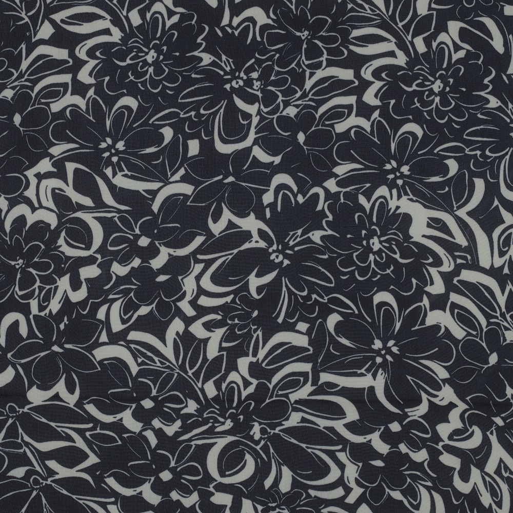 Chiffon delicato e fluente con una elegante stampa floreale in Navy ed Ecru – come una passeggiata in un giardino fiorito notturno. I fiori sottili e stilizzati si stagliano dolcemente sullo sfondo scuro donando al tessuto un aspetto raffinato e femminile.