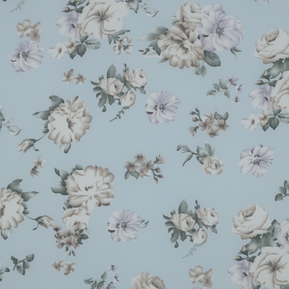 Pochi tessuti sono così delicati: questo chiffon leggero presenta un motivo romantico di rose in morbide tonalità di azzurro e grigio su fondo chiaro. Le rose stilizzate sembrano dipinte a mano e conferiscono al tessuto un'elegante leggerezza quasi fluttuante.