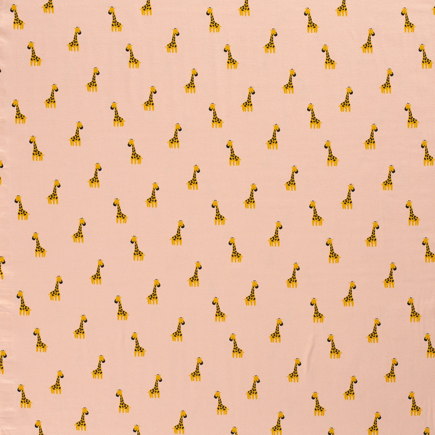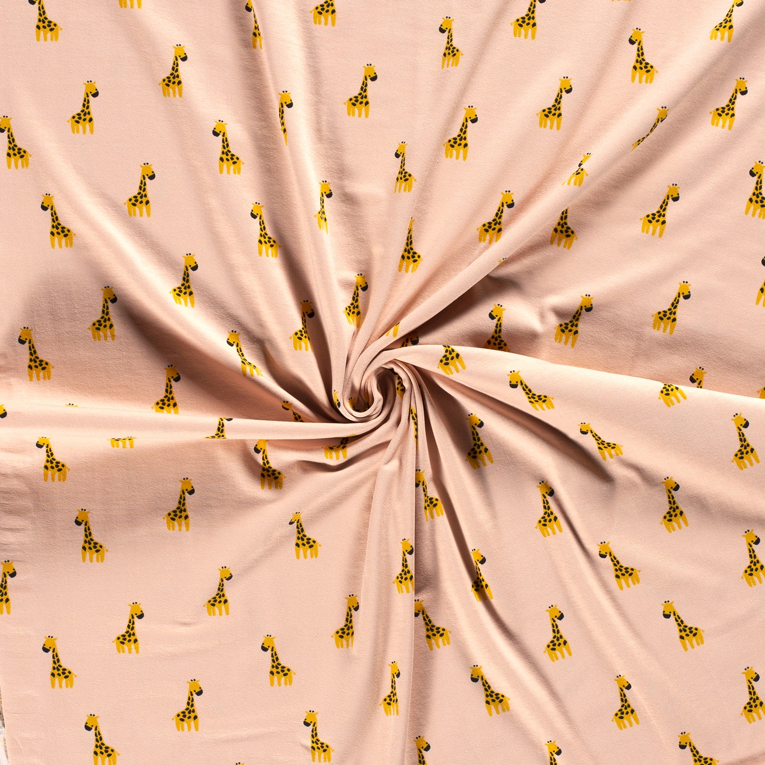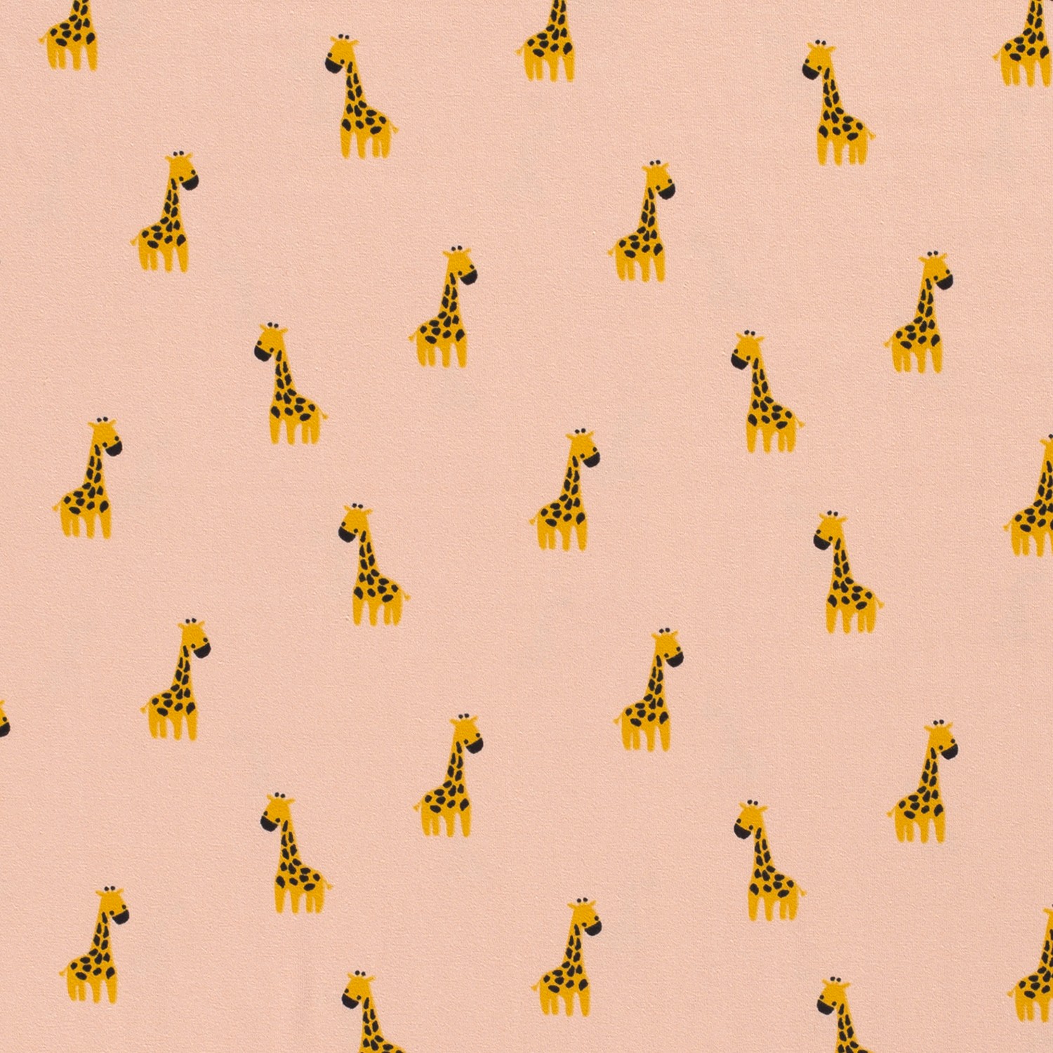 Dolcissimo jersey per piccoli e grandi fan delle giraffe: su una delicata tonalità albicocca si muovono piccole giraffe stilizzate in calde tonalità beige e marroni. Dettagli raffinati come le tipiche macchie e i simpatici visi conferiscono al design un aspetto particolarmente affettuoso e adatto ai bambini.