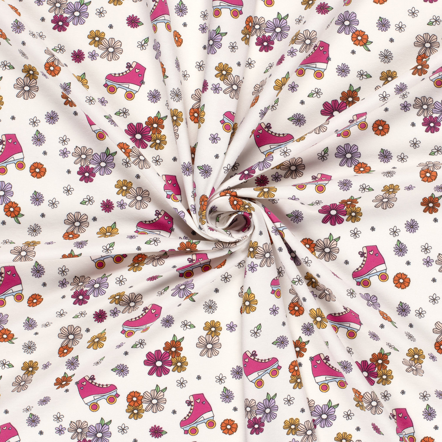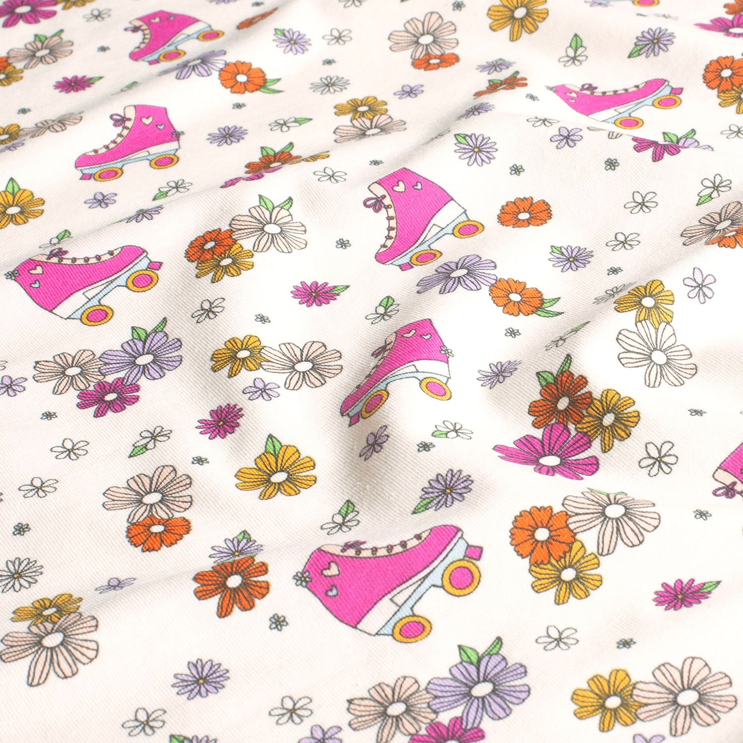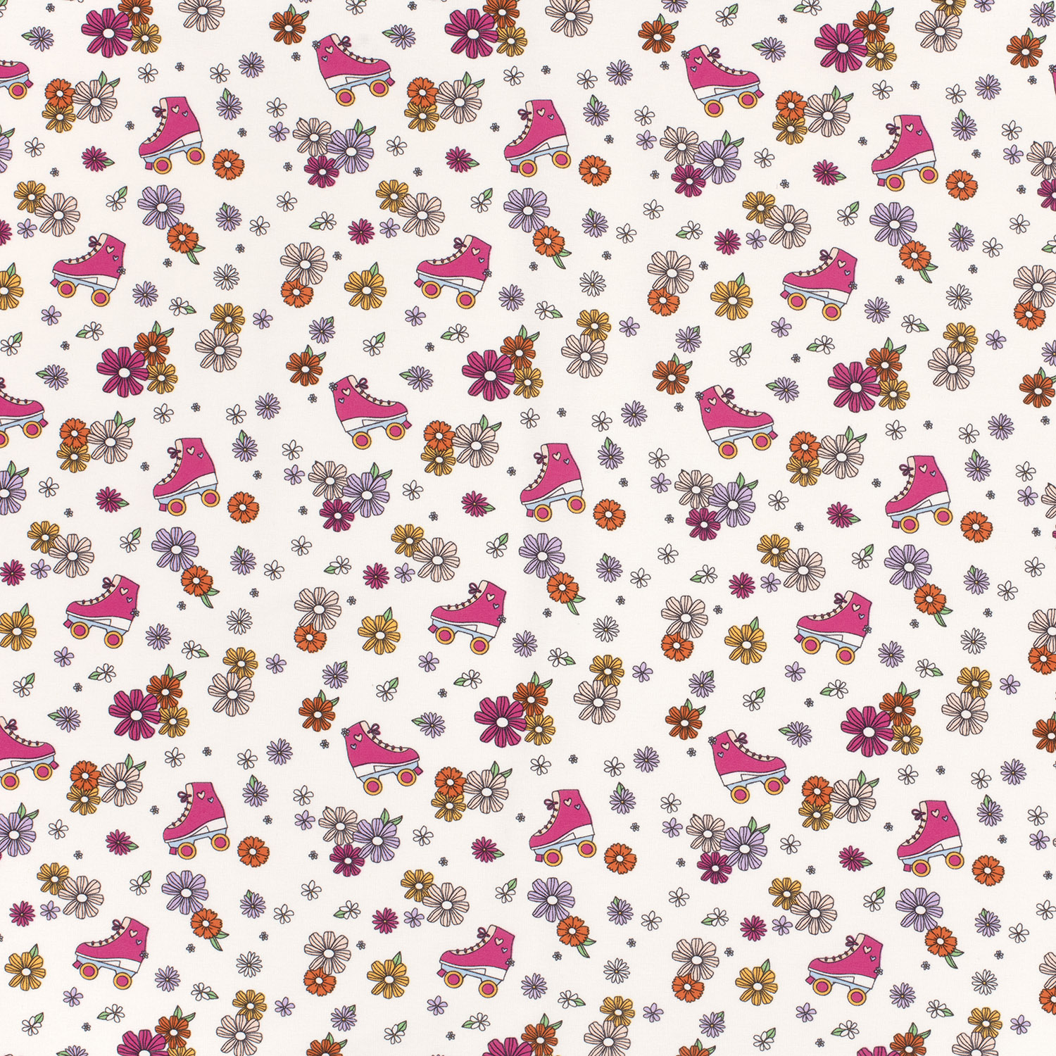 Questa maglia giocosa porta il fascino retrò e l'atmosfera estiva direttamente sul tuo tavolo da cucito! Pattini a rotelle colorati in delicate tonalità pastello rotolano sullo sfondo chiaro ed ecru, accompagnati da piccoli fiori allegri che danno al disegno un tocco romantico e giocoso.