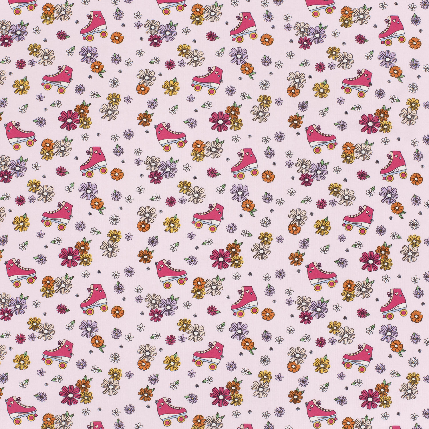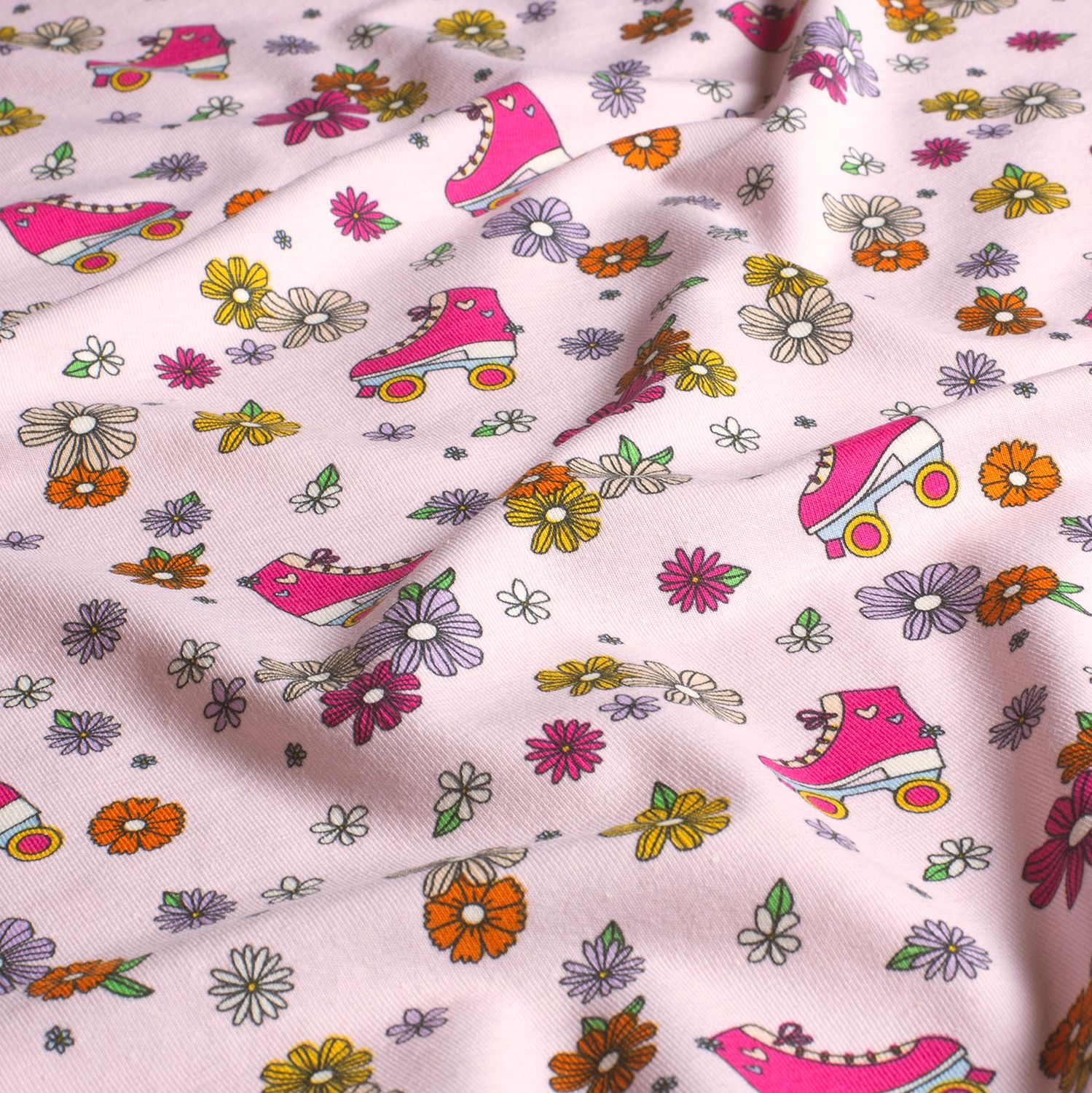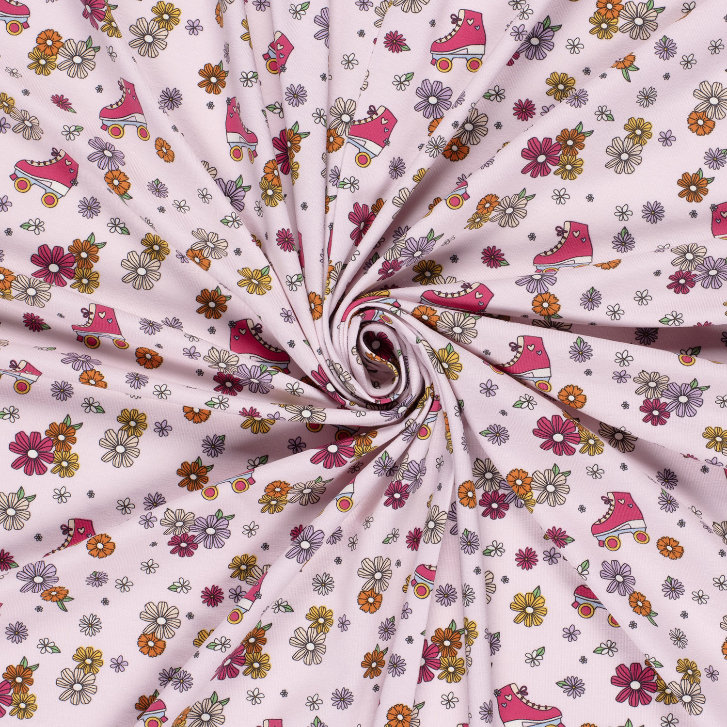 Porta un'atmosfera puramente retrò nella tua stanza del cucito con questa maglia giocosa! Pattini a rotelle colorati si muovono su uno sfondo rosa tenue, amorevolmente combinati con piccoli fiori e dettagli raffinati. Il disegno ricorda le allegre giornate estive, le gelaterie colorate e i giri spensierati sulla pista di pattinaggio.