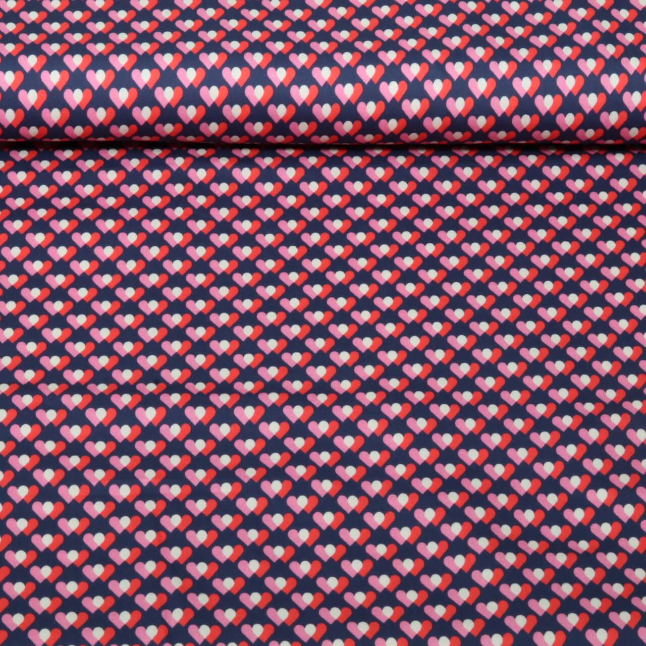 Un tessuto come una dichiarazione d'amore: cuori stilizzati e ornamenti giocosi in tonalità armoniose si allineano su un profondo sfondo blu notte. Le delicate sfumature di rosa e rosso, il sottile color crema e gli accenti di colore rendono il disegno vivace senza essere eccessivo: perfetto per chi ama i dettagli romantici.