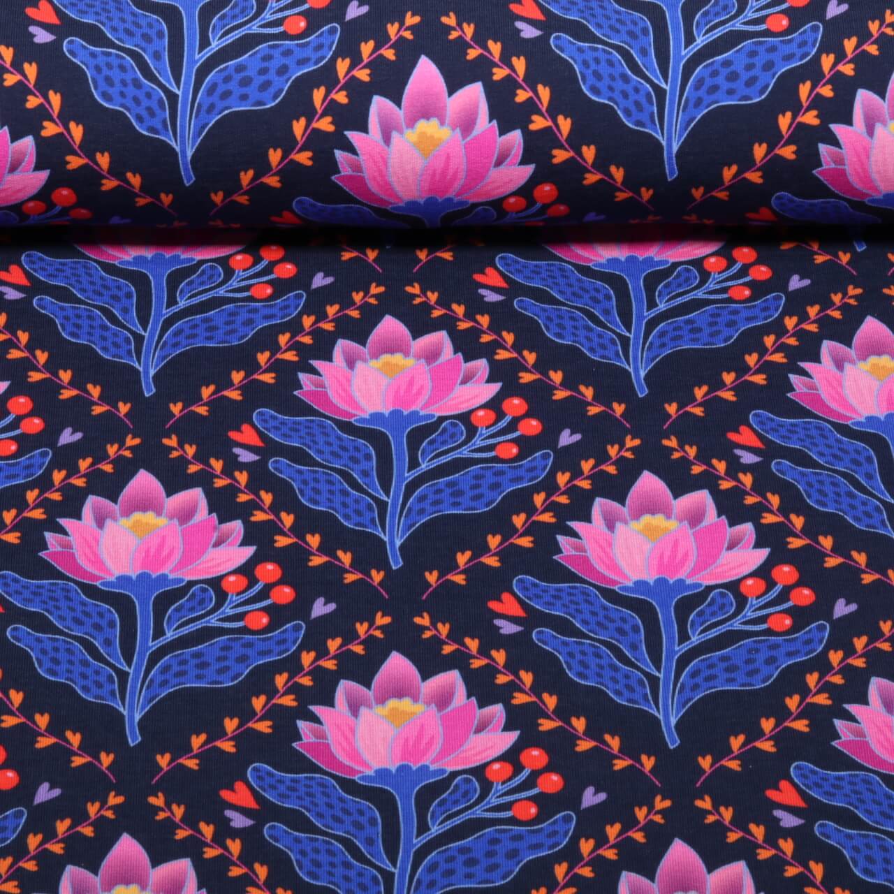 Un'attrazione regale: un gioco artistico di cuori in filigrana, punti giocosi e maestosi fiori di loto risplende su un profondo blu reale. I caldi toni del rosso e del rosa dei cuori incontrano delicati dettagli ornamentali nei toni dell'oro e del crema, come gioielli di pregio su uno sfondo scuro.