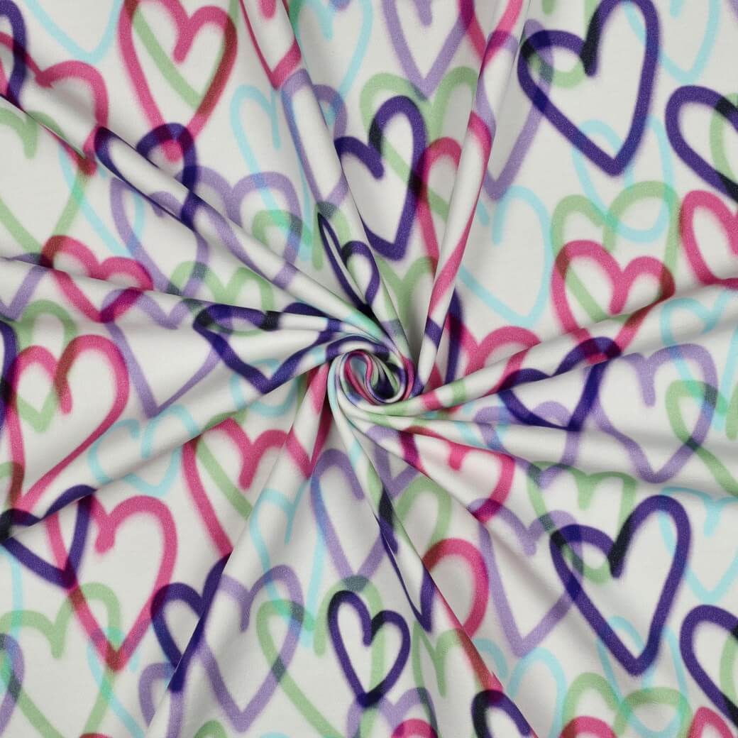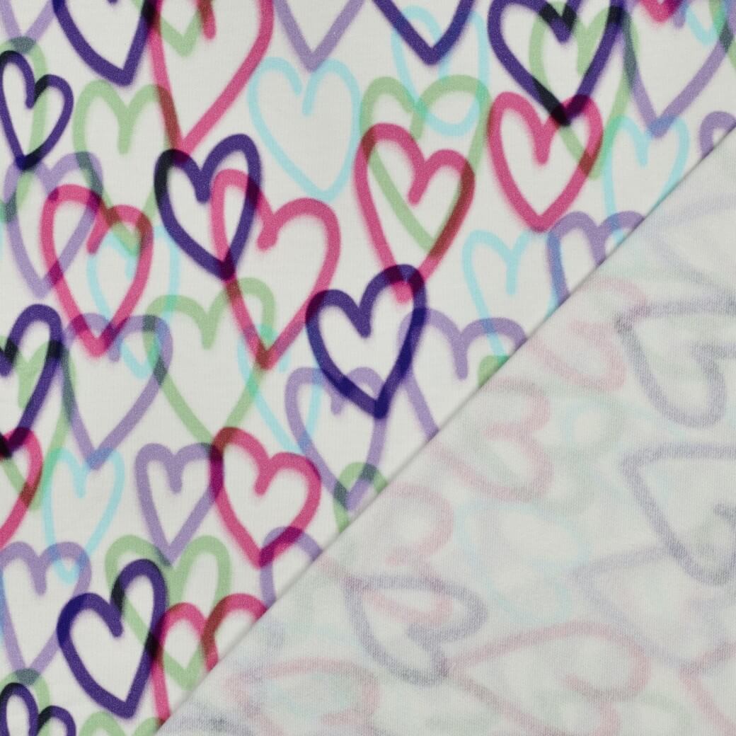 Questo accogliente e morbido tessuto French Terry porta lo stile urbano di strada direttamente sul tuo tavolo da cucito. I colorati cuori graffiti stampati in digitale danzano sul tessuto in colori vivaci e ad alto contrasto e ricordano il muro di una casa spruzzato in modo creativo: vibranti, moderni e un vero e proprio colpo d'occhio.