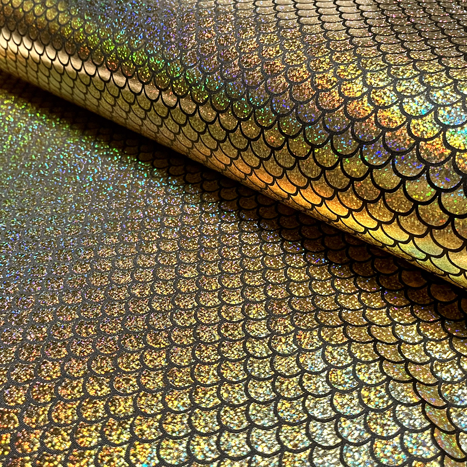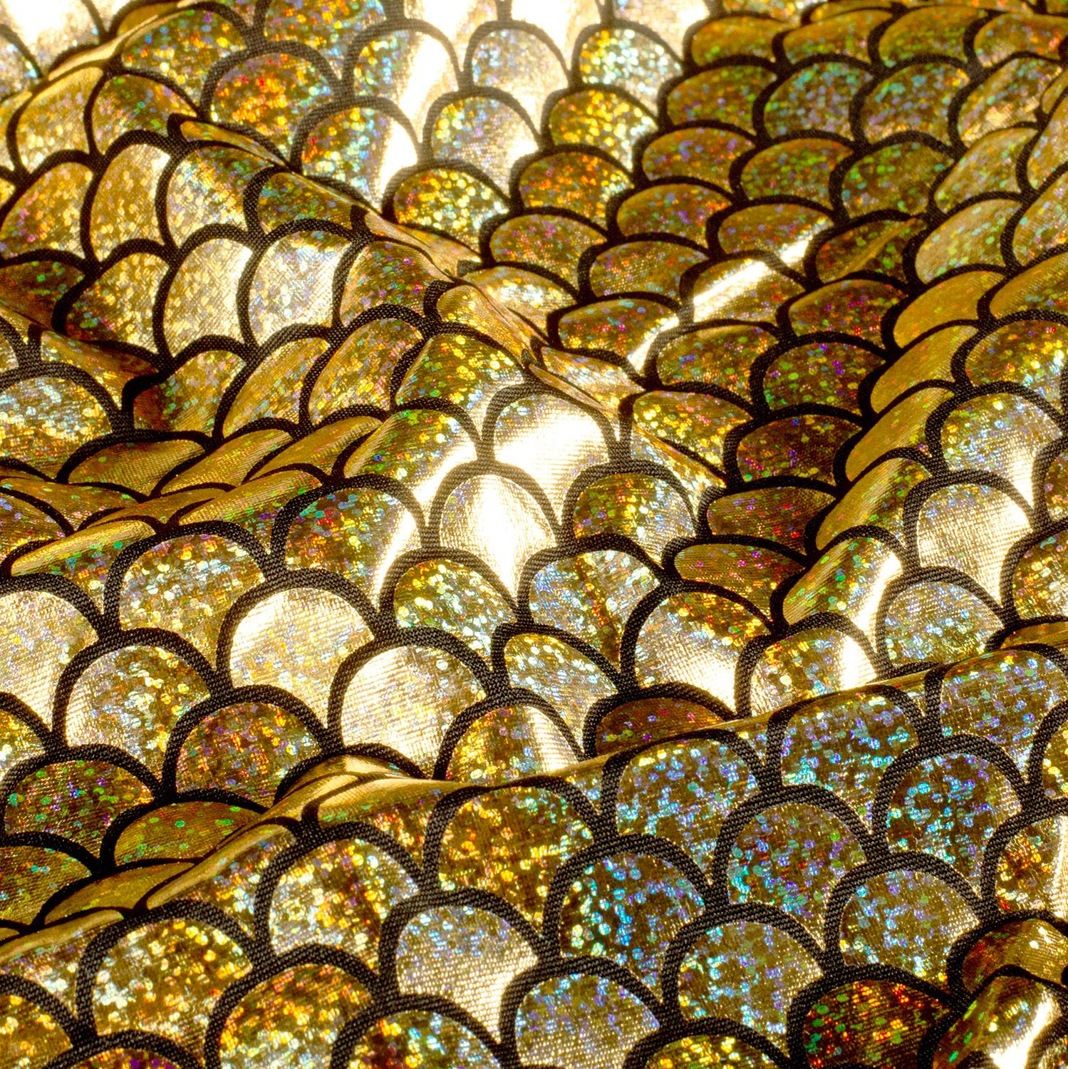 La stampa foil oro riflette la luce a ogni movimento e crea un effetto di splendore spettacolare – perfetto per costumi, spettacoli, carnevali, feste a tema o gruppi di danza. Che sia sirena, dea del mare, creatura fantasy o spettacolo glamour sul palco: con questo tessuto ogni outfit diventa un punto luce straordinario.