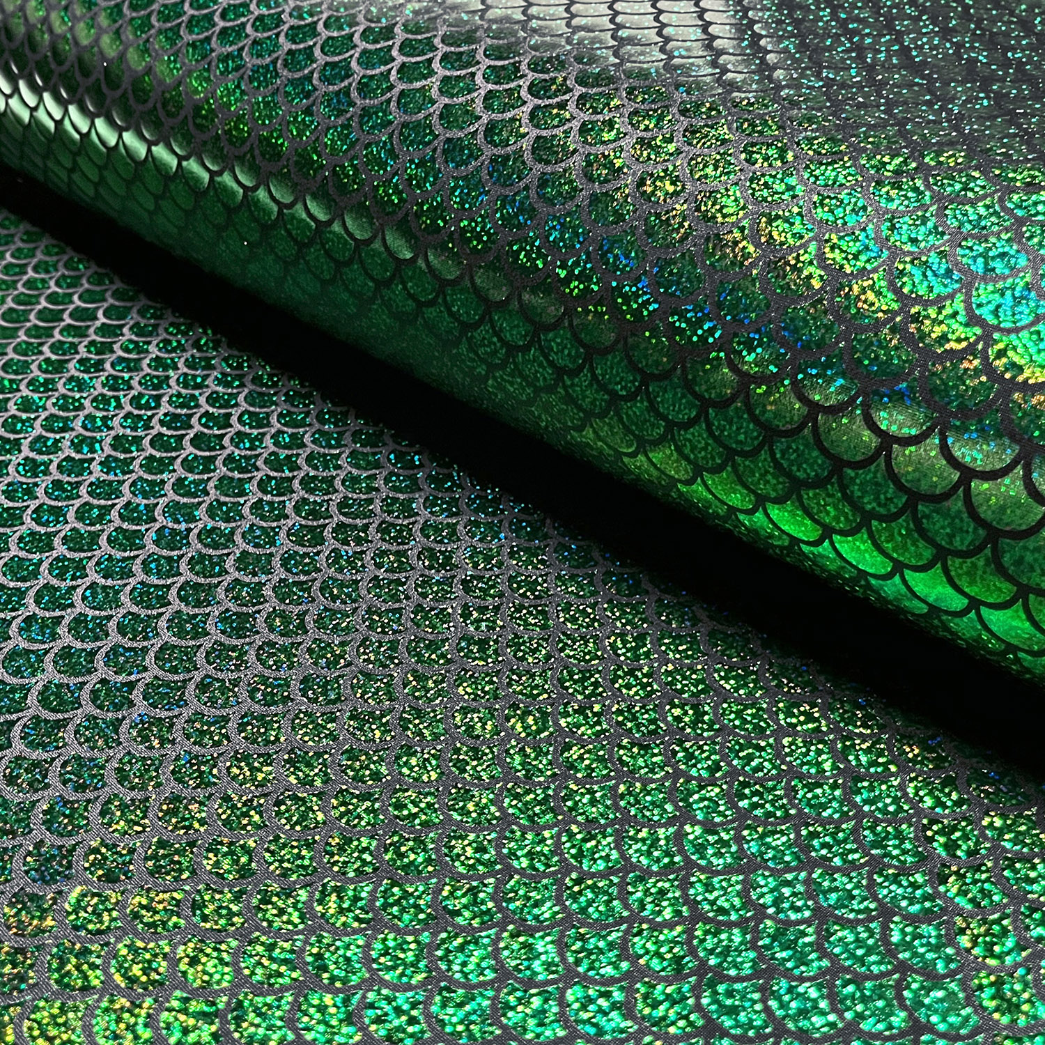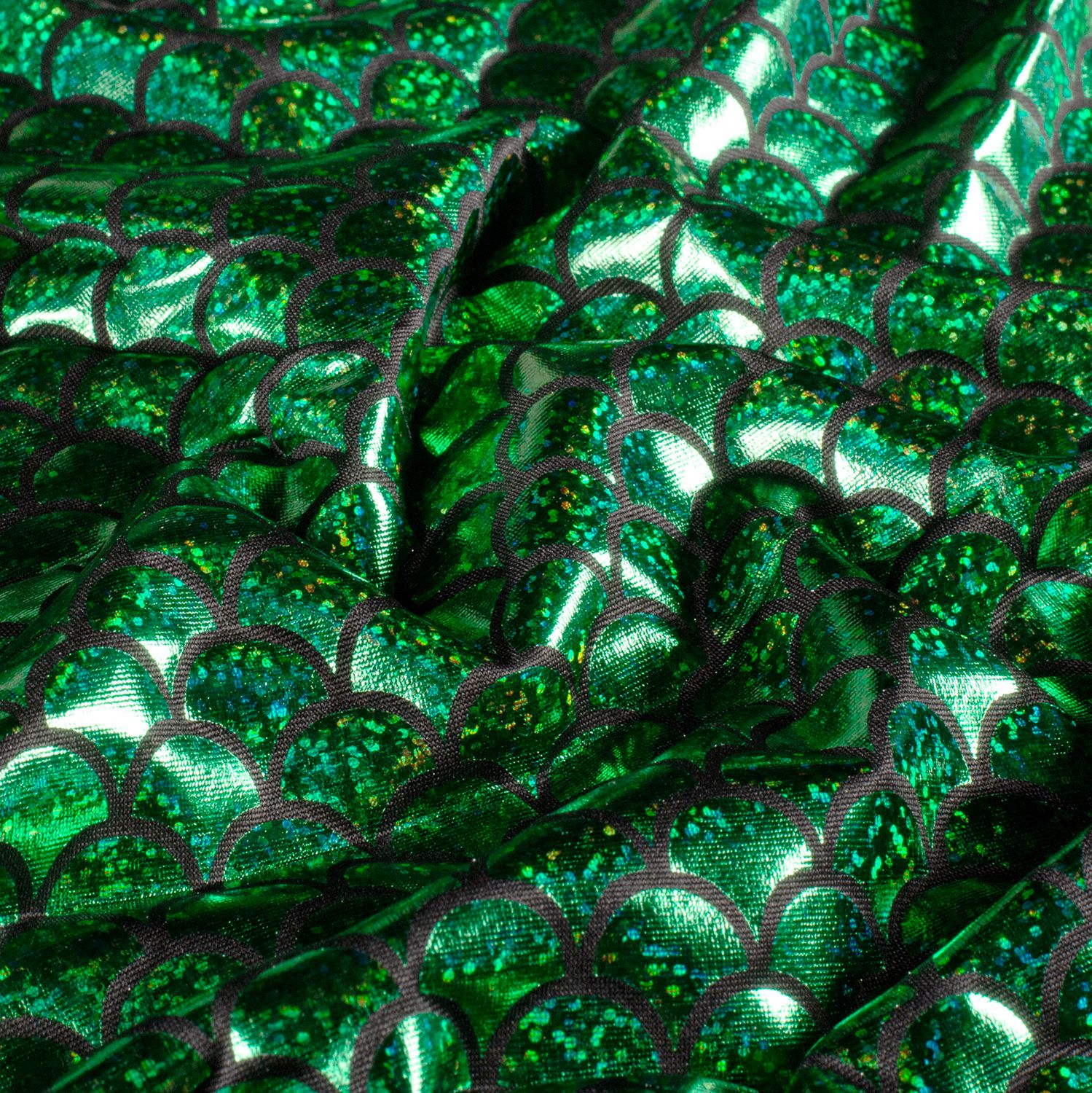 Con questo tessuto sirena scintillante ti immergi direttamente in un mondo sottomarino brillante. Il motivo a squame evidente in verde smeraldo luminoso è impreziosito da una stampa foil metallizzata che scintilla misteriosamente a seconda della luce – proprio come le squame di una sirena.