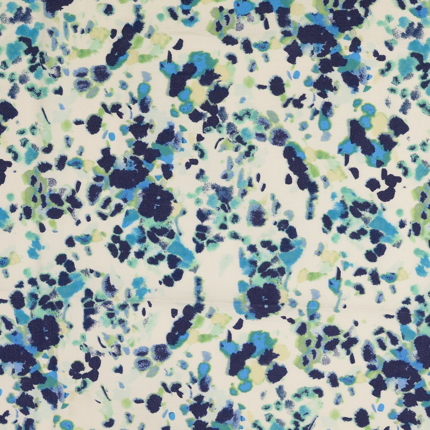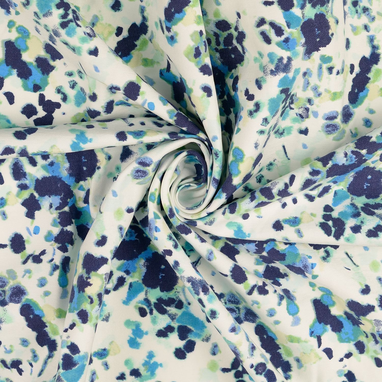 Un tessuto per pantaloni moderno con un tocco artistico: su una base chiara color ecrù si distribuiscono macchie di colore irregolari in varie tonalità di blu – dal delicato azzurro pastello al blu scuro intenso. Le macchie sembrano applicate con un pennello e conferiscono al tessuto un aspetto vivace ma elegante.